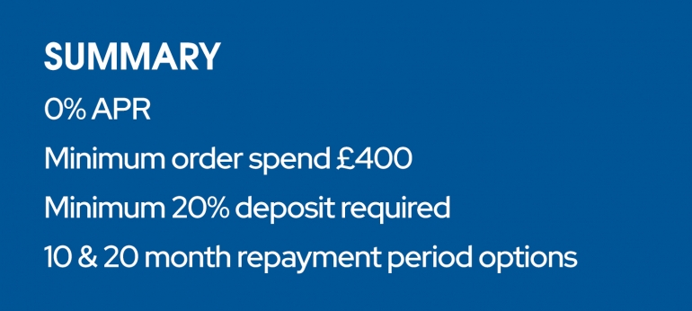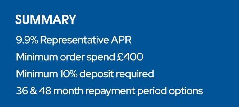Our 10 month interest free finance is available on orders over £400, with 20 months available on orders over £1500. Our 9.9% Representative APR finance option is available over 36 or 48 months on all orders over £400.